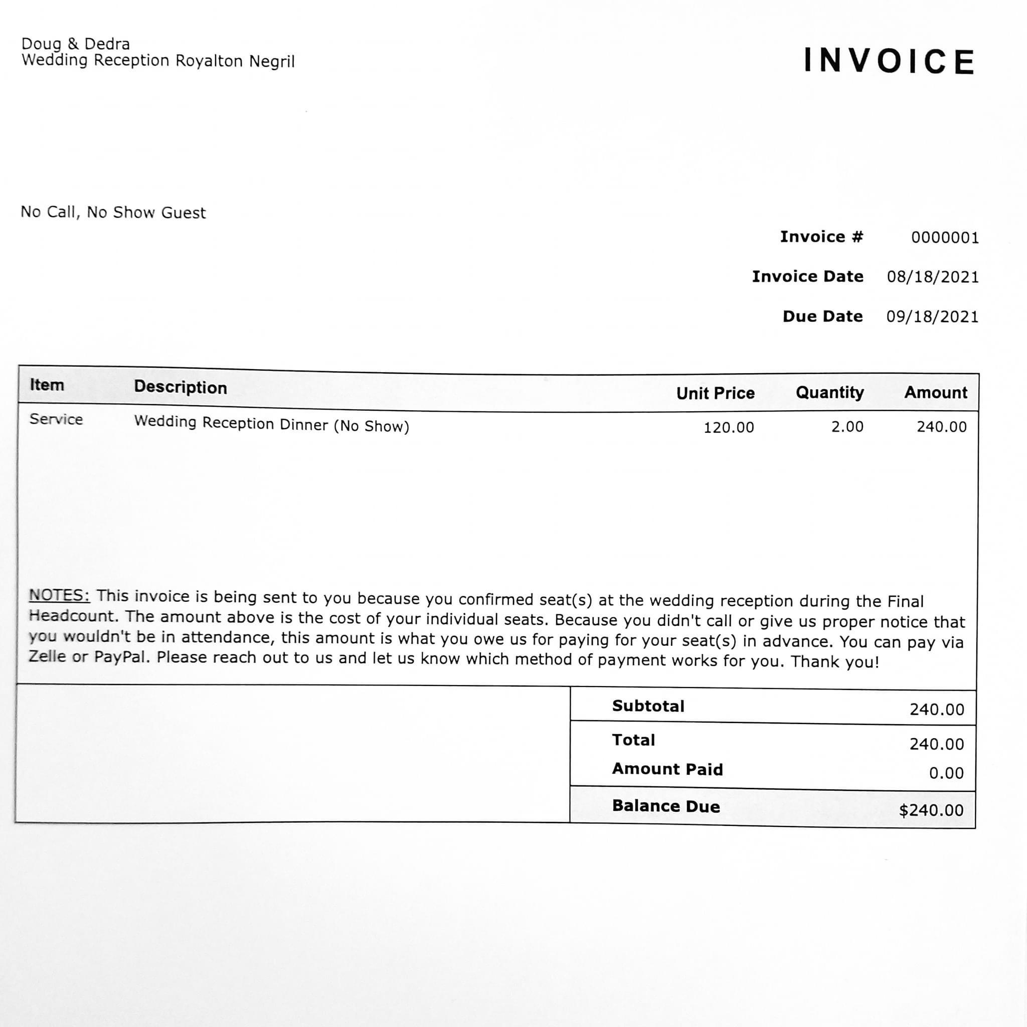 Račun je na spletu objavil jezen gost, ki je od mladoporočencev prejel račun za neudeležbo. Na računu je prejel postavko “no-show” za 120 ameriških dolarjev z opisom: “Ta račun ste prejeli, ker ste potrdili sedeže na poročnem sprejemu. Zgornji znesek je strošek posameznega sedeža.” Opis še dodaja, da ta znesek bremeni gosta, “ker ni poklical ali v pravočasnem roku sporočil, da se poroke ne bo udeležil.” Ker je gost najavil, da bo pripeljal +1, so organizatorji poroke seveda zaračunali dva sedeža v skupnem znesku 240 ameriških dolarjev.