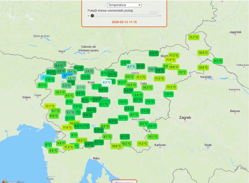 Nad Slovenijo danes prevladuje spremenljiva oblačnost. Po podatkih ARSO je na zahodu več jasnine, medtem ko na vzhodu vztraja pretrgana oblačnost. Popoldne bo tudi drugod več sončnih obdobij. Najvišje dnevne temperature bodo od 11 do 16 °C, v severni Sloveniji med 8 in 11 °C.