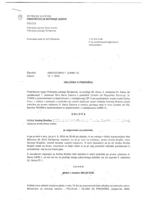 „S sosedom sva se zvečer vračala z njive, kjer sva pobirala fižol in ko sva se peljala mimo romskega naselja je začelo čisto brez vsakega vzroka leteti na naju kamenje in zemlja, zraven pa psovke in zmerjanje, majmun…. od otrok in odraslih. Prideva domov, pokličeva 113 in prijaviva. Policija naredi zapisnik in gre tja, da njim kazni, ki jih seveda ne bodo nikoli plačali saj so nedotakljivi,“ piše Brečko, ki dodaja tudi zapis globe, ki mu je jo izrekla policija!