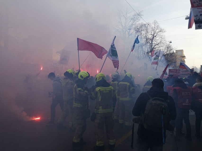 Protest gasilcev ušel izpod nadzora, odjeknile detonacije, Urška pa je mahala