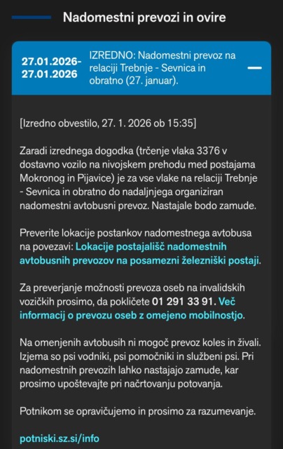 Po neuradnih podatkih je bil v nesreči udeležen dostavni kombi, ki je ob trčenju obstal ob železniški progi. Fotografije s kraja dogodka nam je poslal bralec, na njih pa je videti kombi ob vlaku in zavarovano območje nesreče. Zaradi izrednega dogodka je na relaciji Trebnje – Sevnica in obratno do nadaljnjega organiziran nadomestni avtobusni prevoz. Potniki naj računajo na zamude.