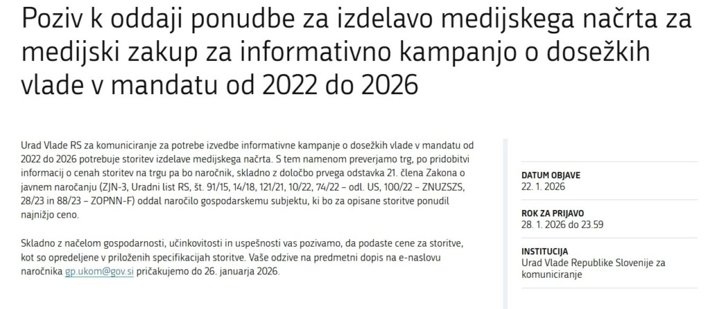 “Urad Vlade RS za komuniciranje za potrebe izvedbe informativne kampanje o dosežkih vlade v mandatu od 2022 do 2026 potrebuje storitev izdelave medijskega načrta. S tem namenom preverjamo trg, po pridobitvi informacij o cenah storitev na trgu pa bo naročnik, skladno z določbo prvega odstavka 21. člena Zakona o javnem naročanju (ZJN-3, Uradni list RS, št. 91/15, 14/18, 121/21, 10/22, 74/22 – odl. US, 100/22 – ZNUZSZS, 28/23 in 88/23 – ZOPNN-F) oddal naročilo gospodarskemu subjektu, ki bo za opisane storitve ponudil najnižjo ceno. Skladno z načelom gospodarnosti, učinkovitosti in uspešnosti vas pozivamo, da podaste cene za storitve, kot so opredeljene v priloženih specifikacijah storitve. Vaše odzive na predmetni dopis na e-naslovu naročnika [email protected] pričakujemo do 26. januarja 2026,” je razpis, kjer se bo nekdo osrečil za 40.000 evrov, vlada, beri koalicija, pa bo na račun davkoplačevalcev dobila krasno reklamo, beri kampanja pred volitvami. Nismo prvi, ki na to opozarjamo.