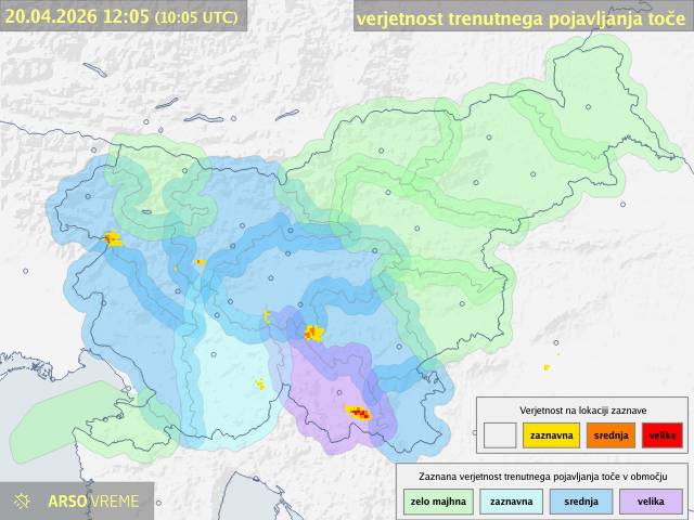 Iz objavljenih podatkov ARSO izhaja, da je bila ob 12. uri največja verjetnost toče na območju Kočevja, kjer so meteorologi ocenili najvišjo stopnjo tveganja. Na širšem območju jugovzhodne Slovenije je bila verjetnost označena kot zaznavna, kar pomeni, da so razmere za nastanek toče ugodne.