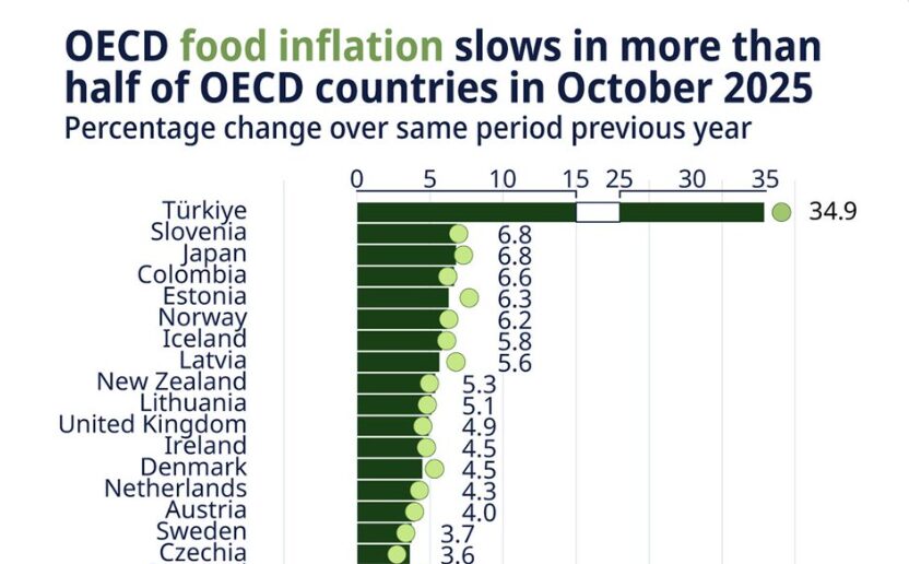 Najnovejši grafikon OECD za oktober 2025 kaže, da se je inflacija hrane v več kot polovici držav članic upočasnila. To pomeni, da cene še rastejo, a počasneje kot lani. V številnih državah Zahodne Evrope se gibljejo med 1 in 4 odstotki, ponekod pa so se cene hrane celo začele zniževati. Na papirju zveni spodbudno. A pogled na Slovenijo hitro spremeni ton.