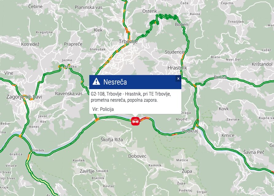 Cesta Trbovlje – Hrastnik je pri Termoelektrarni Trbovlje popolnoma zaprta. Po podatkih prometno-informacijskega centra bo zapora predvidoma trajala dlje časa. Za osebna vozila je obvoz možen po cesti Trbovlje – Boben – Hrastnik, medtem ko je za tovorna vozila obvoz urejen preko Celja. Voznikom priporočajo, da zaporo upoštevajo in pot prilagodijo trenutnim razmeram na cestah.